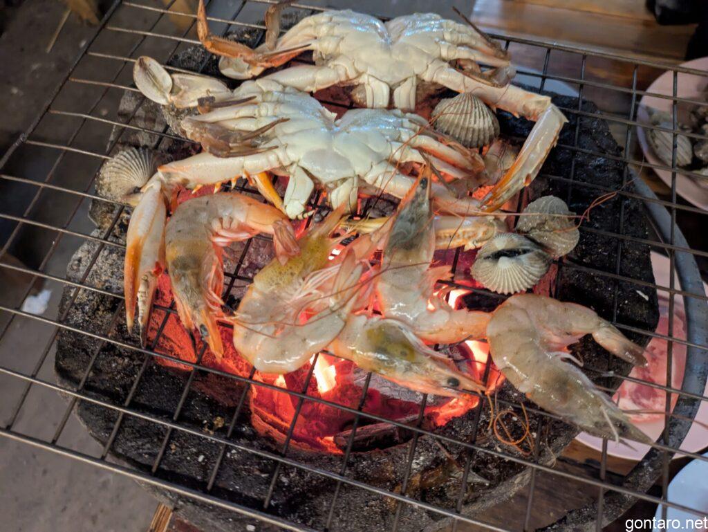 F嬢が持ってきた🦐や🦀等のシーフードを網の上に並べます。