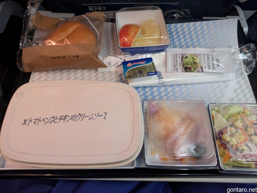 3列シートを独占し、くの字になりながら寝たものの、寝返りも打てずに身体はバキバキの状態でありました。そして、テーブルの上には食事が置いてありました🍲