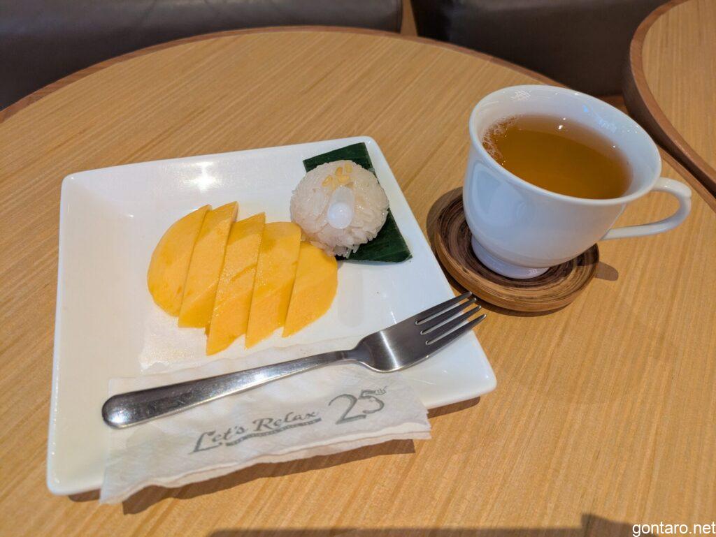 施術後はサービスでカオニャオ・マムアンがついてきまして、フロント近くのソファーに座りながら余韻タイム👍