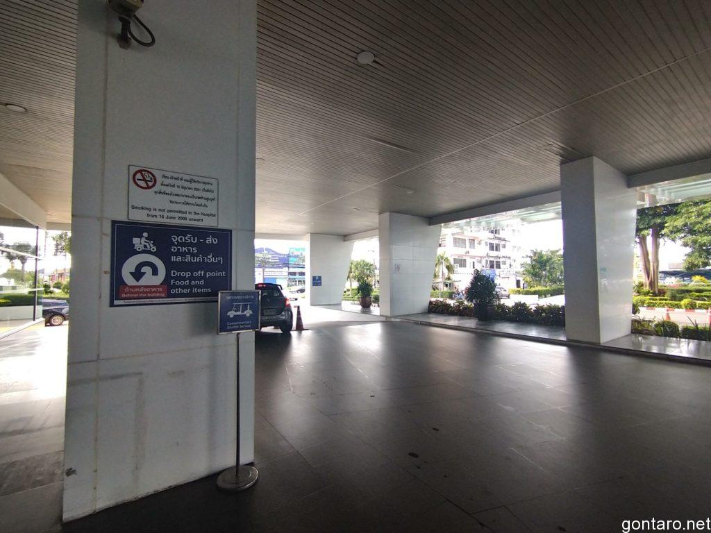 バンコク病院パタヤのメインエントランスにて、病院スタッフの方にPCR検査の旨を