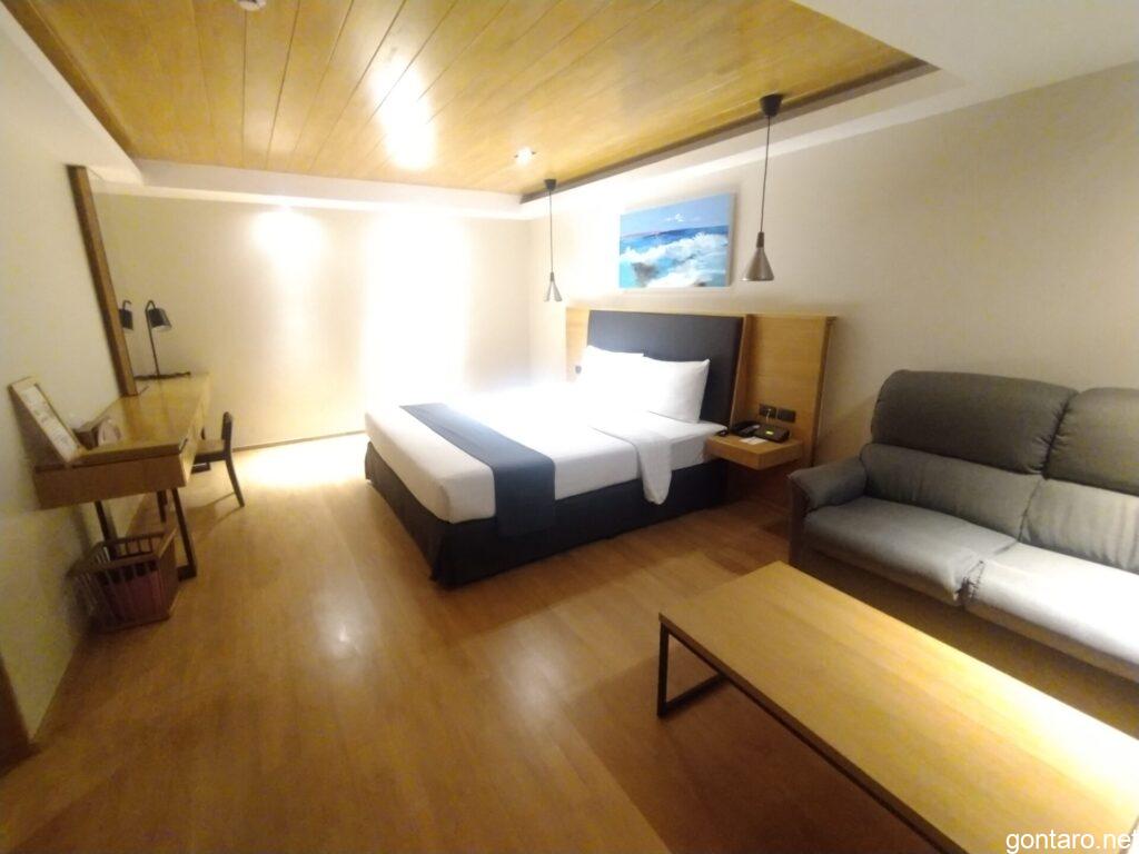今回はいつもより広めのジュニアスイート(48㎡)をチョイス、写真右側のソファーで