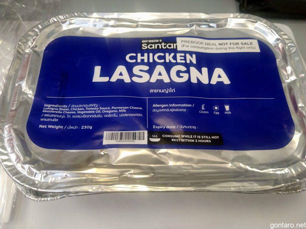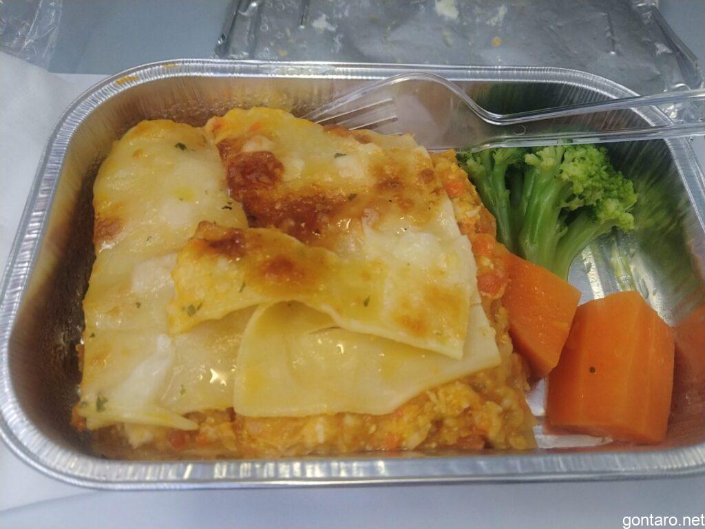 機内食は予め頼んであったチキンラザニア、往復の機内食をチキンラザニアにしたので